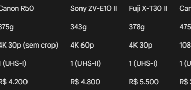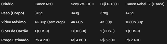 Se você já tem um faturamento online estável e busca portabilidade, a Canon R50 é o ápice da engenharia atual para viajantes.